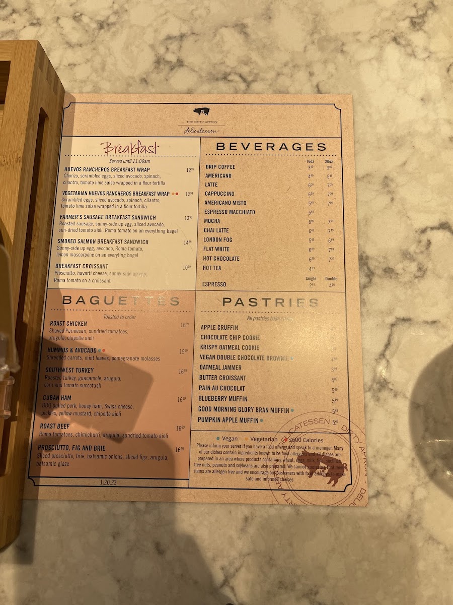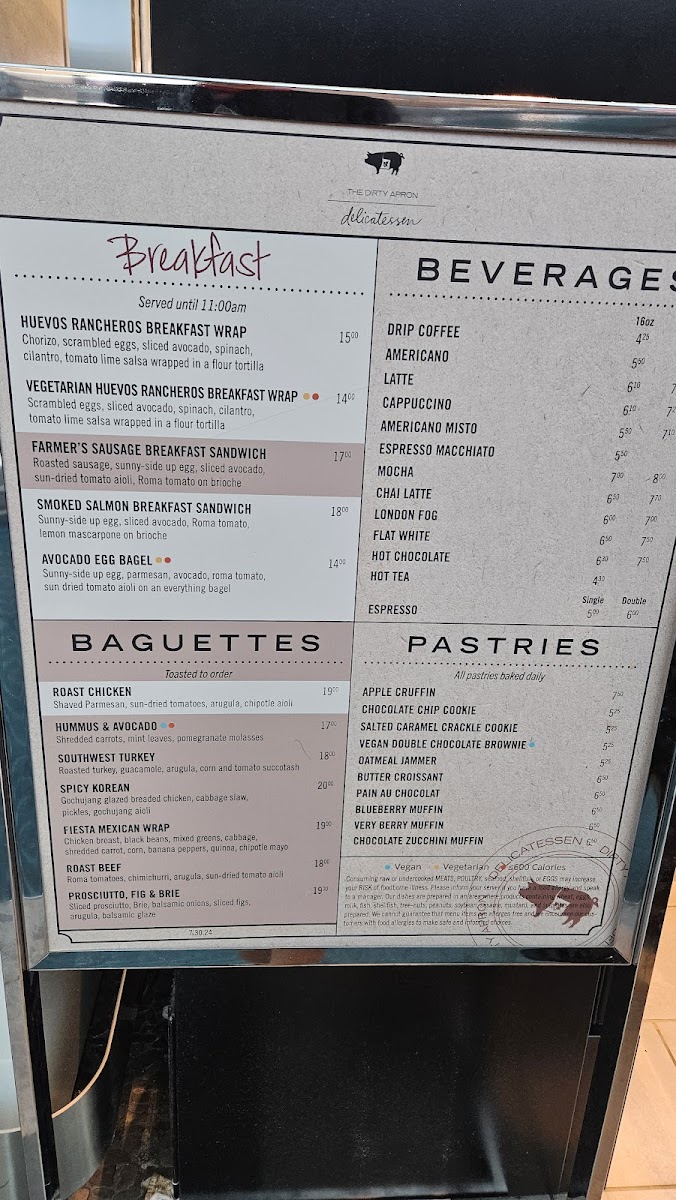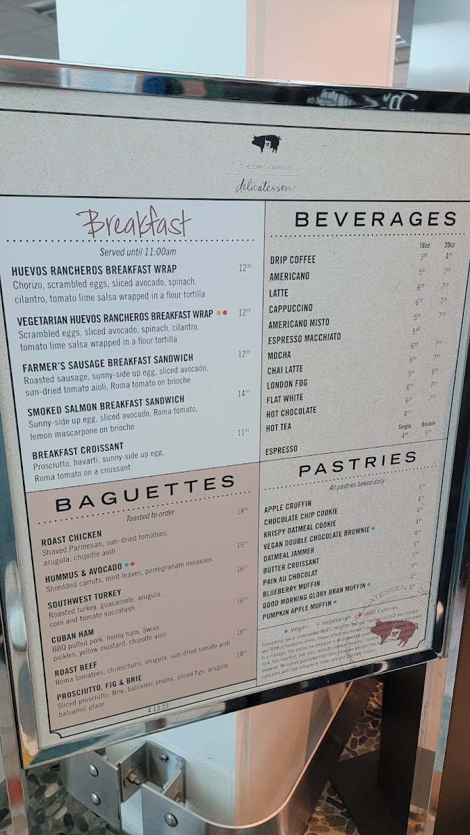 Dirty Apron offers a straightforward menu that blends casual café fare with comforting, thoughtfully prepared dishes. Whether you're starting your day or looking for a satisfying bite between flights, you’ll find familiar flavors presented with care.